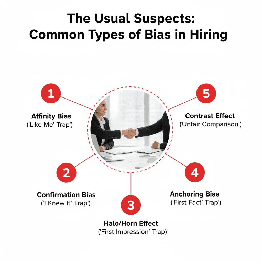 Common Types: The most common types of bias in hiring include affinity bias (favoring people like you), confirmation bias (seeking to confirm your own beliefs), and the halo/horn effect (letting one good or bad trait overshadow everything else).