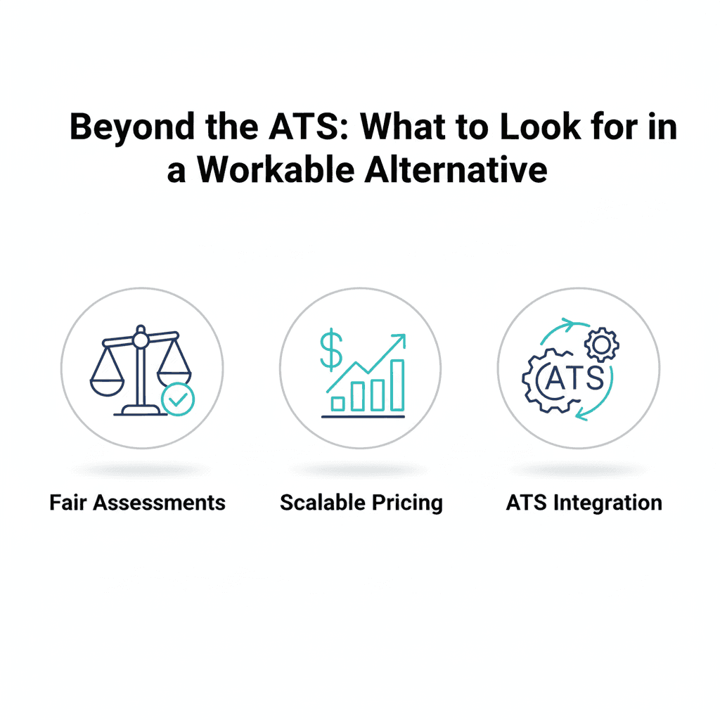 A simple graphic titled "Beyond the ATS: What to Look for in a Workable Alternative" showing icons for "Fair Assessments," "Scalable Pricing," and "ATS Integration.